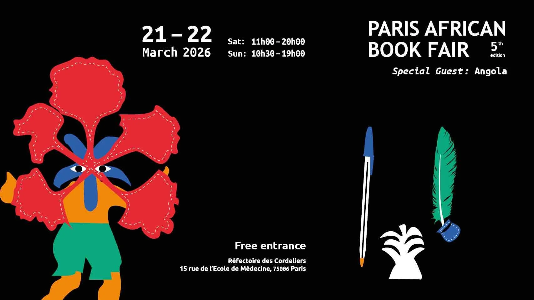We eagerly await your arrival on March 21, and 22 for this 5th edition which promises to be a rich and rewarding event with over 150 publishers and 400 authors in attendance. Around 20 conferences will be offered, covering a variety of topics (history, literature, economics, politics, ecology, science, philosophy, etc.), including those related to this year's theme, as well as a presentation of Angolan literature. As every year, the Paris African Book Fair will be an opportunity to meet and listen to leading figures in African and Afro-descendant literature. Twenty countries will be represented.